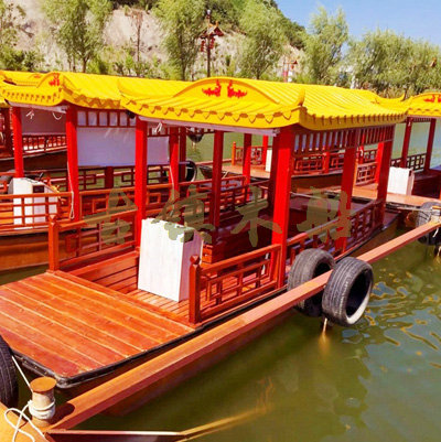 畫舫船就是裝飾古典華麗的游船,是"中國(guó)風(fēng)"的仿古游船,結(jié)合古典園林建筑,體現(xiàn)了中華文明的古典藝術(shù).畫舫船豪華而又古典,船上的建筑按照中國(guó)古代建筑里的亭臺(tái)樓閣,建筑工藝之復(fù)雜,要求之嚴(yán)格,仿古畫舫游船的特點(diǎn)飛檐翹角、玲瓏精致的四角亭子逐漸成形,赫然立于船頭,美人靠、盤龍柱子、彩畫……龍柱上的浮雕盤龍和祥云一層扣著一層,層層錯(cuò)落有致,雕刻精細(xì)到盤龍身上的每一個(gè)鱗片都細(xì)細(xì)可數(shù),古代皇家標(biāo)志性元素,在畫舫船上體現(xiàn)的淋漓盡致。除了雕刻、花窗,整條船還有一個(gè)看點(diǎn),那就是弧線優(yōu)美、高高翹起的船尾。游船并不大,長(zhǎng)約10米、寬3米,但是整體看起來堪稱一件藝術(shù)品。船尾的雕花欄桿與船艙、船頭的雕刻遙相呼應(yīng),船身四周貼著浮雕祥云,給整條船增添了富貴、華麗的氣質(zhì)。